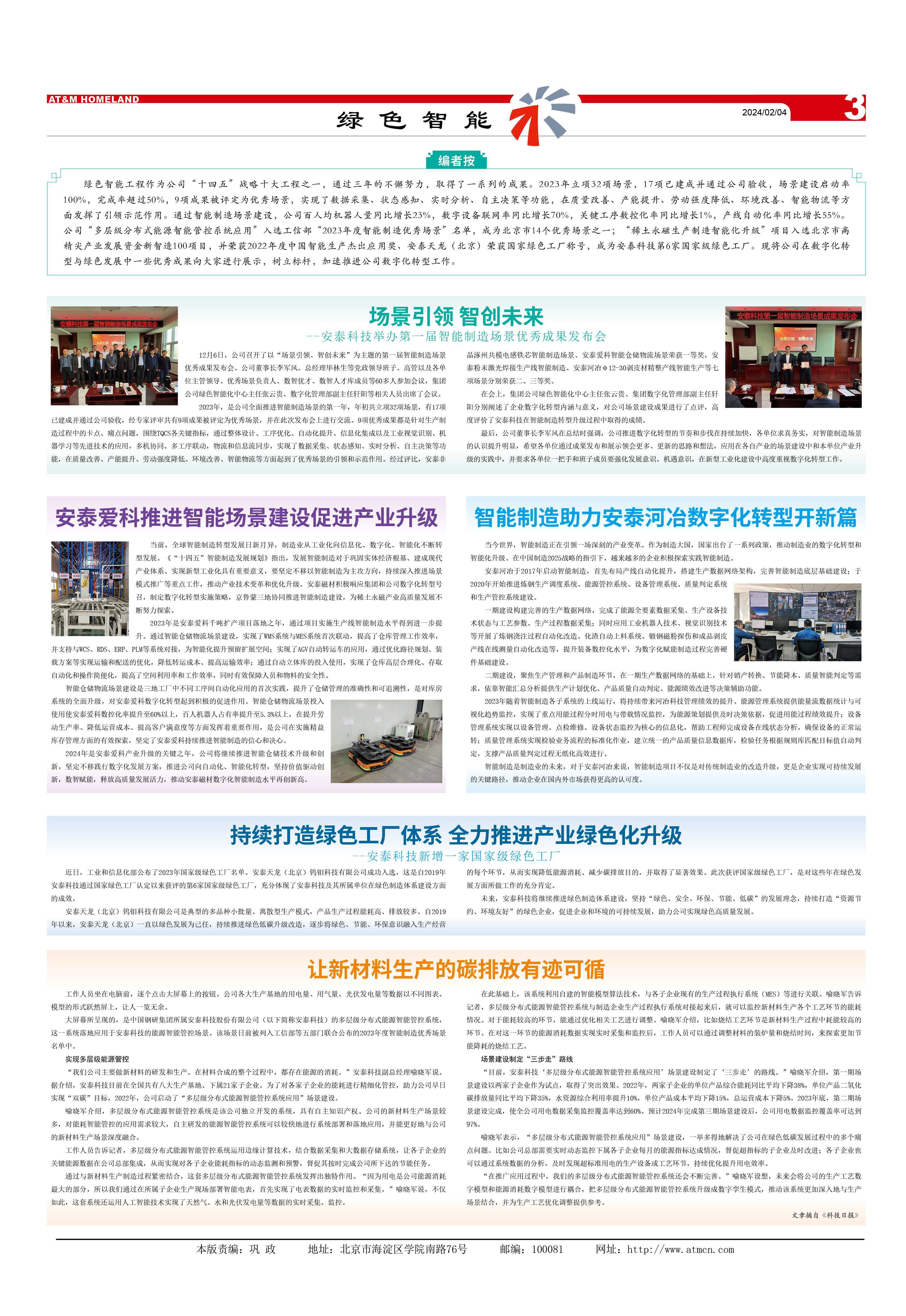 綠色智能工程作為公司“十四五”戰(zhàn)略十大工程之一,通過三年的不懈努力,取得了一系列的成果。2023年立項32項場景,17項已建成并通過公司驗(yàn)收,場景建設(shè)啟動率100%,完成率超過50%,9項成果被評定為優(yōu)秀場景,實(shí)現(xiàn)了數(shù)據(jù)采集、狀態(tài)感知、實(shí)時分析、自主決策等功能,在質(zhì)量改善、產(chǎn)能提升、勞動強(qiáng)度降低、環(huán)境改善、智能物流等方面發(fā)揮了引領(lǐng)示范作用。通過智能制造場景建設(shè),公司百人均機(jī)器人量同比增長23%,數(shù)字設(shè)備聯(lián)網(wǎng)率同比增長70%,關(guān)鍵工序數(shù)控化率同比增長1%,產(chǎn)線自動化率同比增長55%。公司“多層級分布式能源智能管控系統(tǒng)應(yīng)用”入選工信部“2023年度智能制造優(yōu)秀場景”名單,成為北京市14個優(yōu)秀場景之一;“稀土永磁生產(chǎn)制造智能化升級”項目入選北京市高精尖產(chǎn)業(yè)發(fā)展資金新智造100項目,并榮獲2022年度中國智能生產(chǎn)杰出應(yīng)用獎、安泰天龍(北京)榮獲國家綠色工廠稱號,成為安泰科技第6家國家級綠色工廠。現(xiàn)將公司在數(shù)字化轉(zhuǎn)型與綠色發(fā)展中一些優(yōu)秀成果向大家進(jìn)行展示,樹立標(biāo)桿,加速推進(jìn)公司數(shù)字化轉(zhuǎn)型工作。